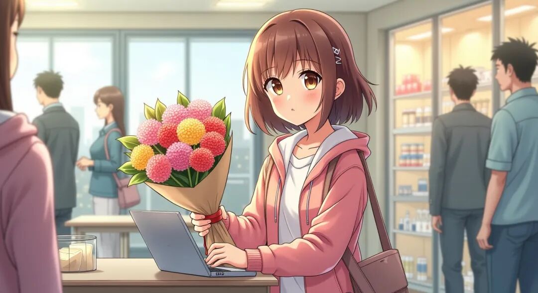 直到商店关门,她才向出口走去。这时,一位手拿鲜花的“夫人,本店经理让我代他向您表示谢意,请接受这束鲜花。”
