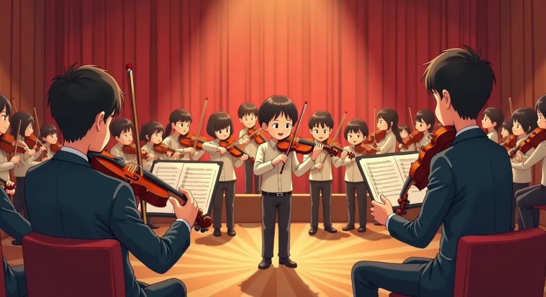 为了培养嘟嘟的艺术修养,爸爸带他到音乐厅欣赏小提琴演奏会。