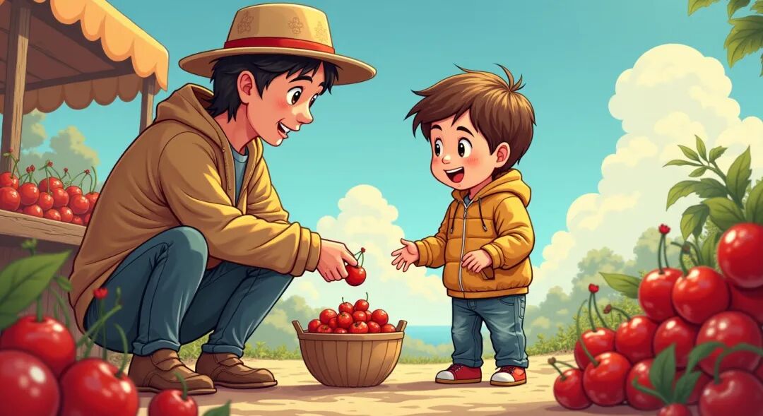 妈妈领儿子去市场买东西时碰见一个卖樱桃的老熟人,老熟人让小孩抓一把樱桃,小孩犹豫了一下,没有动手。