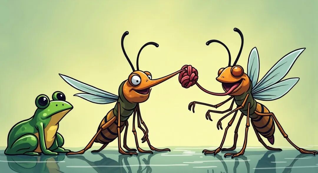 美国蚊子冷笑两声:“哼! 雕虫小技,不足挂齿!”于是他飞向两只青蛙,在他们之间来回了几次,回来时,两只青蛙的舌头结成了一个死结,他牛气地说:“哼! 在我老家,要这样子才能生存!”