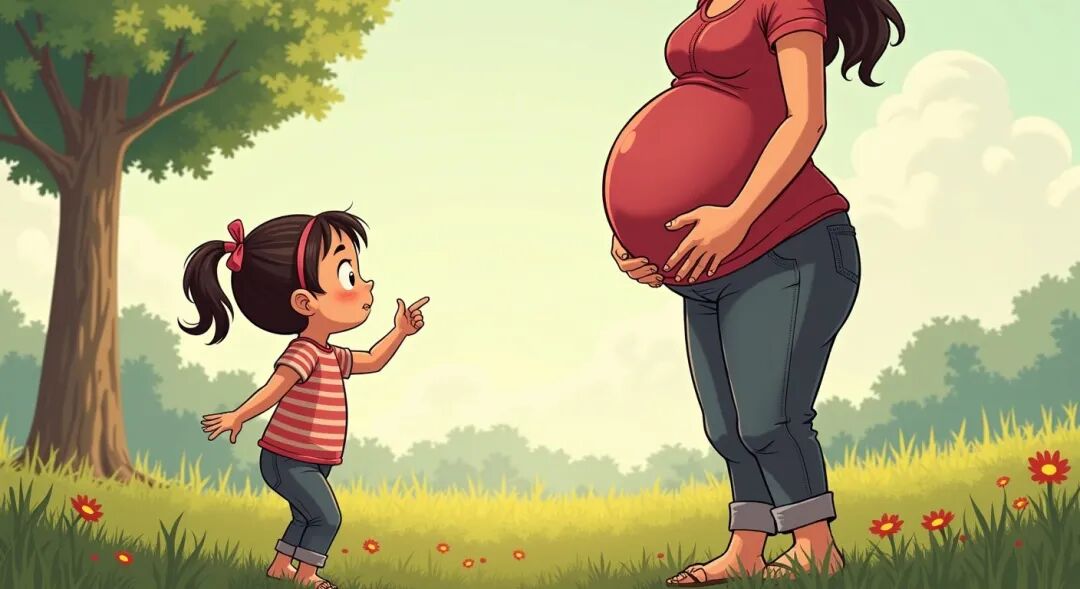 在公园里欢快地嬉戏的一个小姑娘,注意到了一个肚子隆起的孕妇,她好奇地走过去,用手指指着孕妇的肚子,天真地问:“这里面是什么呀?”