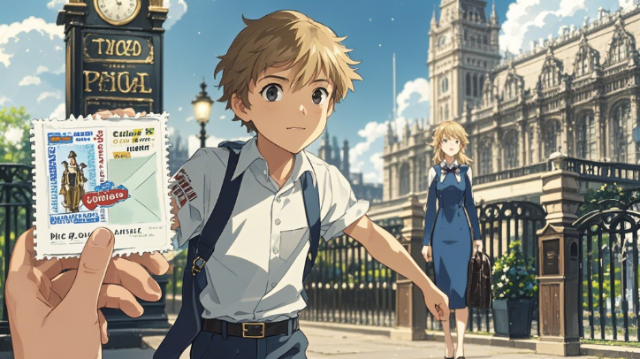 一名异国少年步入伦敦的邮局大楼,手中紧握着一封待寄的信件和一枚事先购置的邮票。他将信件和邮票一同交给了在柜台后的女士。然而,女士却指出:“抱歉,孩子,你必须亲自将邮票粘贴到信封上。”