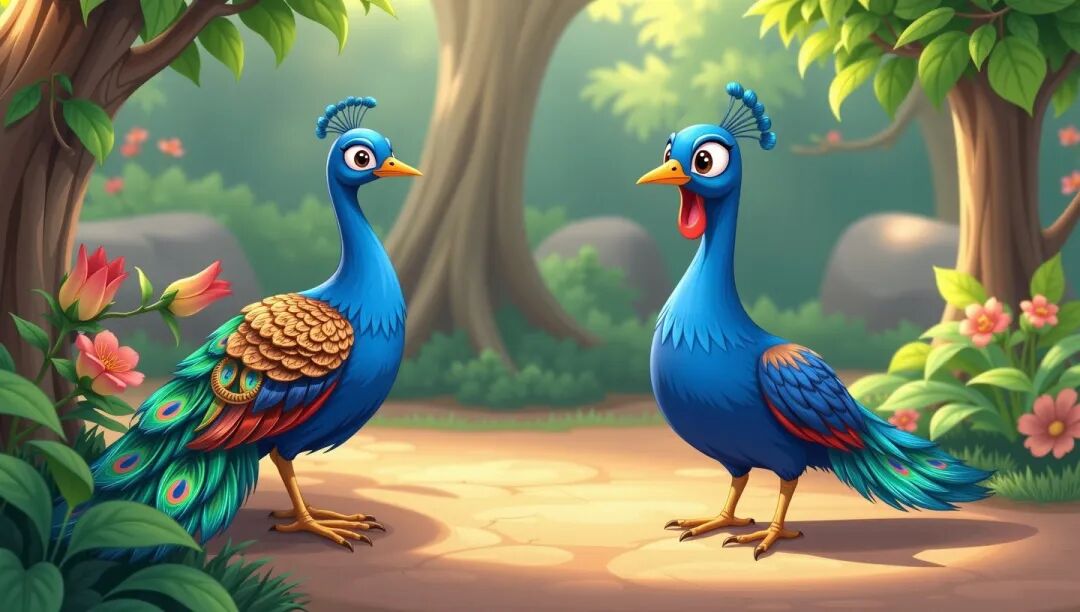 在经过百鸟园时,她们目睹了一只孔雀展开它的尾羽。这时,妹妹兴奋地大声喊道:“妈妈,快来看呀!动物园里有一只母鸡正在开花。”