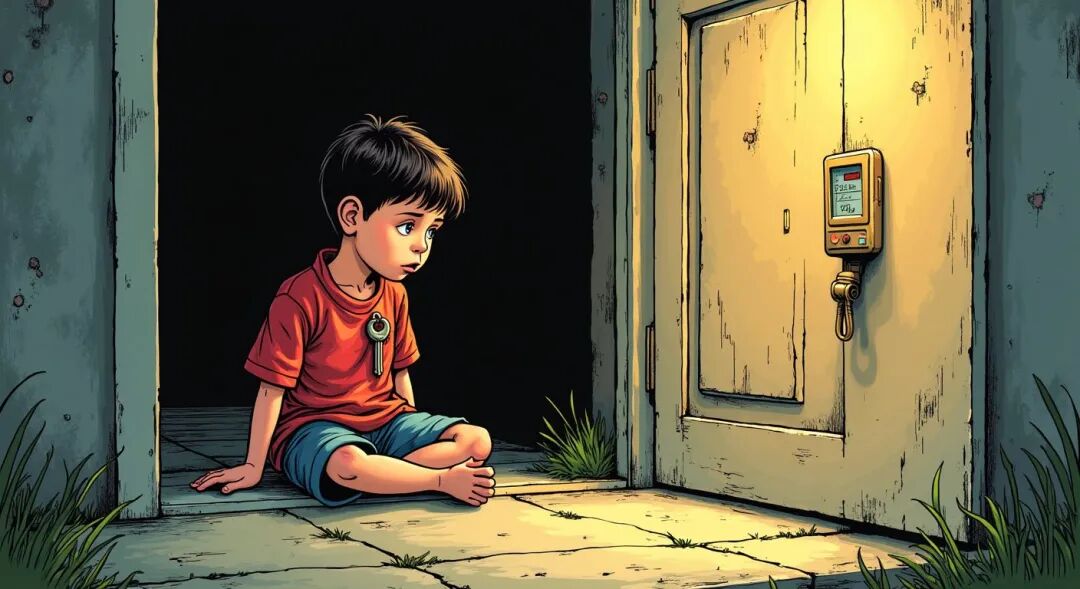 一名窃贼潜入一个社区,发现一个儿童坐在门廊上,颈上挂着一串钥匙。
