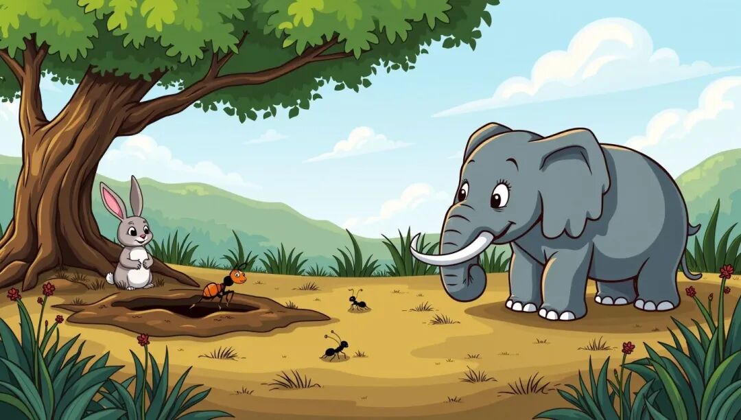 第二天,兔子目睹一头大象同样将身体埋入土中,只露出一条腿。兔子好奇地询问原因。大象眼中突然涌满了泪水,委屈地嘟囔道:“昨天那可恨的蚂蚁把我的兄弟绊倒了,我的兄弟因此变成了植物象。我一定要为我的兄弟报仇,至少也要让它精神分裂!”