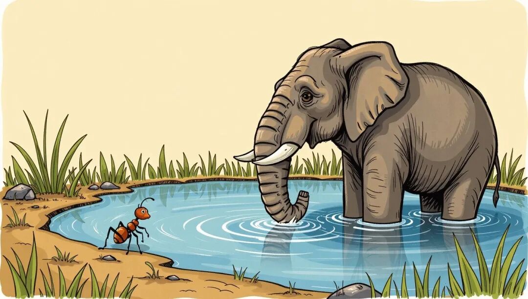 一只蚂蚁走到池塘边缘,看到大象正在水中沐浴,便对大象喊道:“你上来一下。”大象依言上了岸,蚂蚁接着说:“没事了,你可以下去继续洗澡了。”