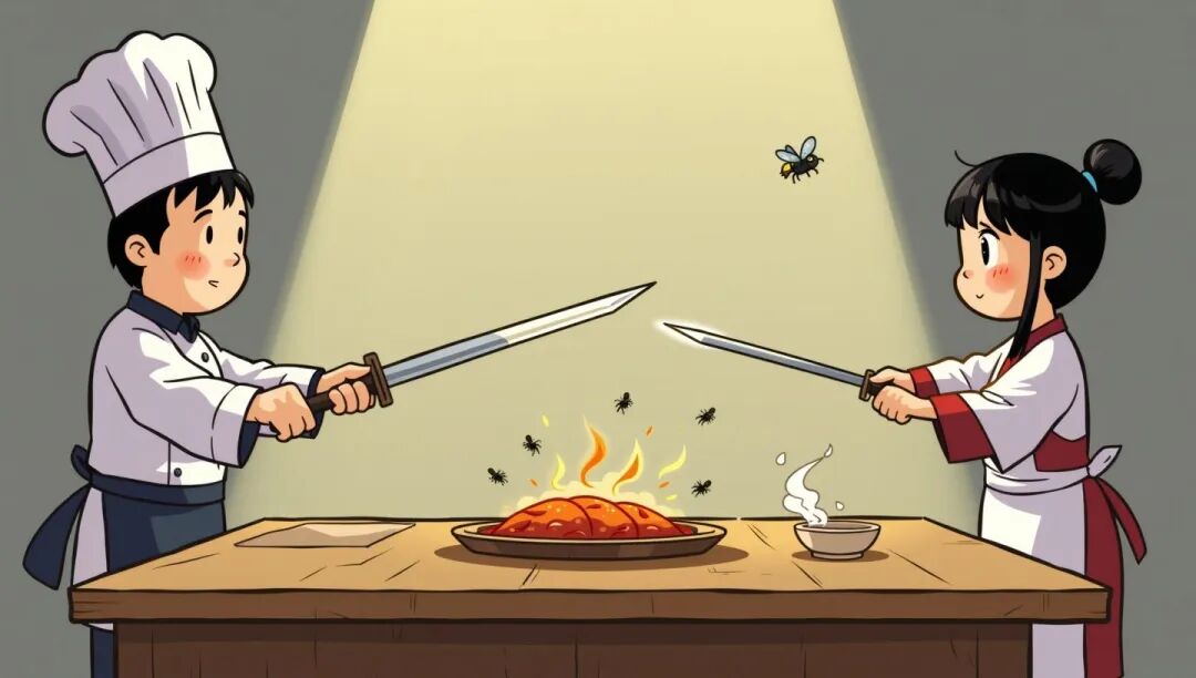 最后亮相的是中国厨师,他刀锋一闪,苍蝇似乎毫无损伤地继续飞翔。裁判仔细检查后,给出了100分的高分。