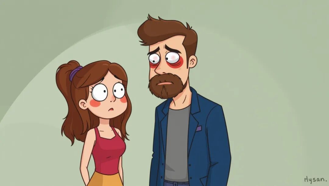 一男士红肿着双眼与女朋友约会,女朋友见到他后伤心地询问:“亲爱的,你怎么了?”