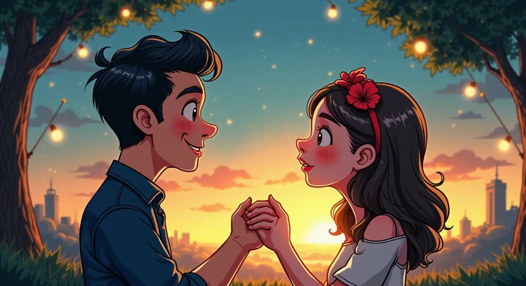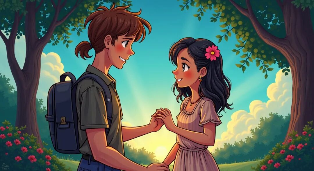 他俩是昨天晚上舞会上认识的,约好翌日黄昏在公园相会。小伙子拉起姑娘的手说道:“你是天上的月亮,地上的清泉。没有你,我无法生活,我真心诚意地向你求婚,做我的妻子吧,亲爱的柳芭!”