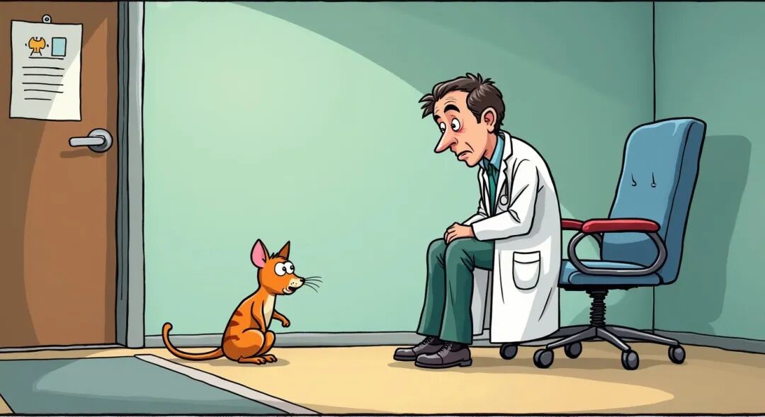 有一位精神病患者一直坚信自己是老鼠,经过医生的治疗,他终于康复了。在出院的那天,患者正要走出门口,突然一只猫出现在他的眼前,让他惊讶不已。