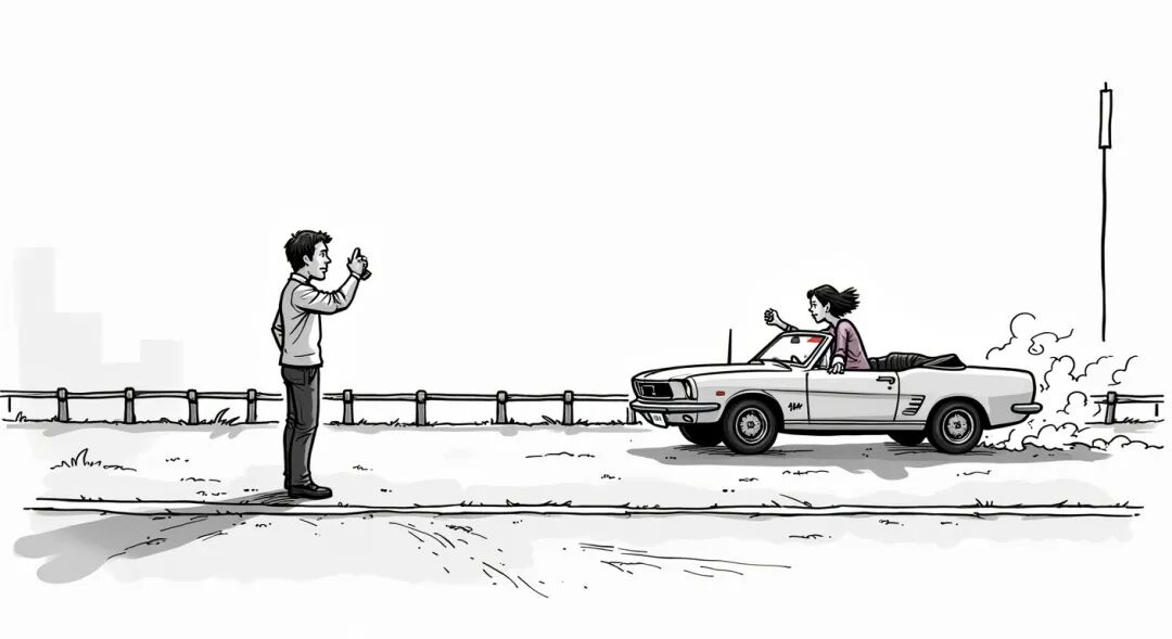 在路边的栏杆边,一位青年正在擦拭额头的汗水,同时紧张地望着繁忙的街道。这时,一辆陈旧的福特车缓缓驶来,从街角的出现。车里的女士紧紧握着方向盘,专注地注视着前方。当车子靠近时,青年激烈地向她示意,并大声呼喊。
