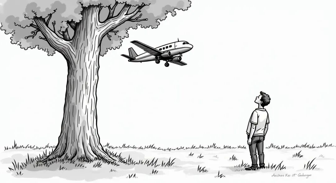 看,只见一架小型飞机挂在树顶上了。“你在那上面干什么?”他问飞行员。飞行员没有受伤,正从树上往下爬。
