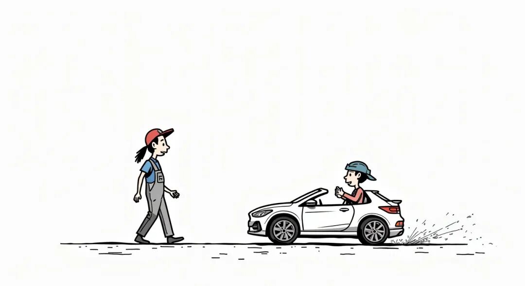 她下了车,一位身着 Mechanic 工作服的男士从聚集的人群中迅速走出,向她走来。“是我让汽车停下来的!”她自豪地说。“我知道是你,”机械师不悦地回应,“因为我正在用力推车!”