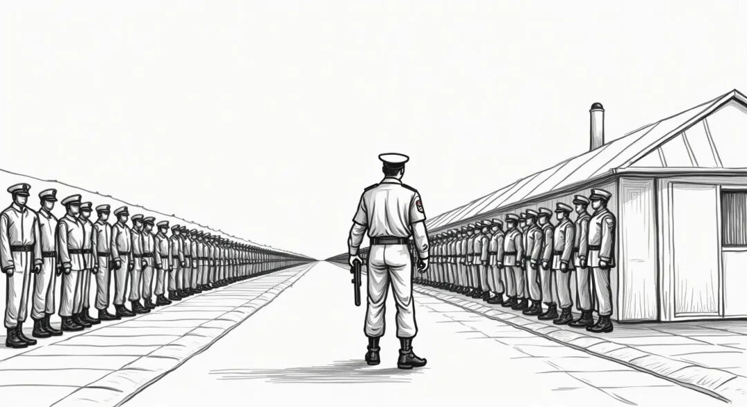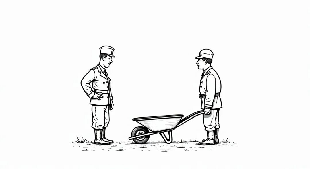 军官在斥责士兵:“列兵杜班,昨天你回营房时喝得烂醉如泥。不仅如此,你还推来了一辆偷来的独轮车。”