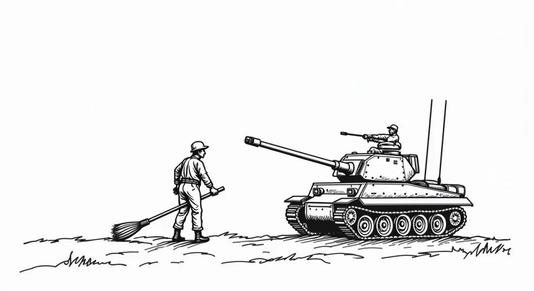 一位农夫不幸被征召入伍,在接受武器装备时,由于步枪库存不足,军官随手给了农夫一把扫帚,并告诉他:“上战场时,你就拿这把扫帚,对准敌人,不停地喊:‘砰,砰,打死你。’ 其他的事情让你的战友来帮忙。”第二天,农夫走上了战场。他躲在战壕里,一直拿着扫帚喊:“砰,砰,打死你。” 竟然真的有敌人被他瞄准并被流弹击中。