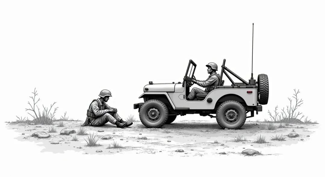 在一场紧张的军事演习中,一位指挥官的吉普车不慎陷入了泥潭。他抬头看见几名士兵正优哉游哉地躺在地上,便命令他们过来援助。
