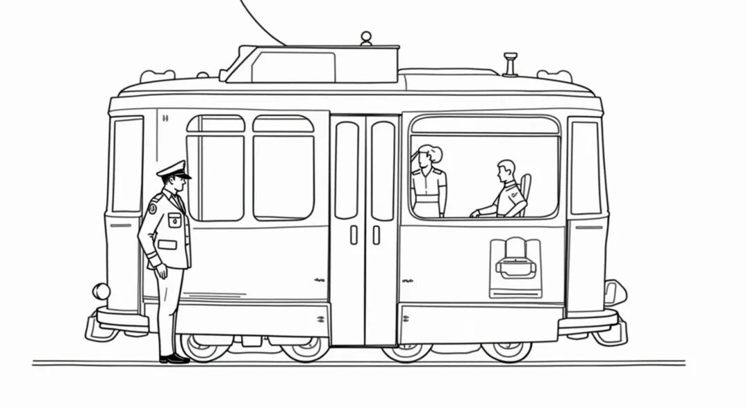 新兵列巴坐在一辆有轨电车里,在一个车站停靠时,上来一位大尉军官,只见列巴“刷”地一下立正姿势站着。