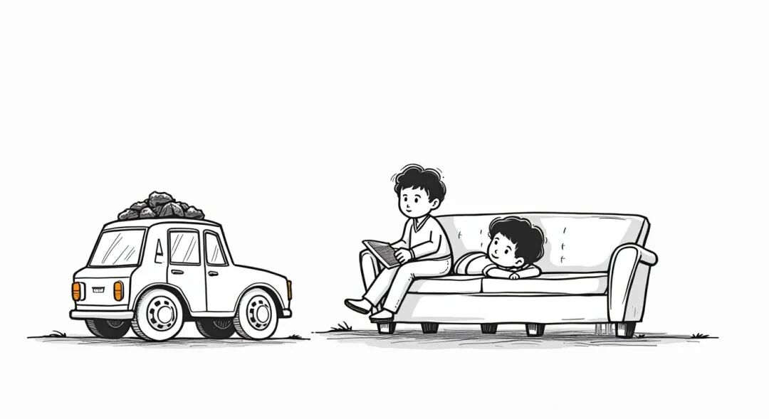 儿子躺在沙发里看画报,母亲气喘吁吁地走进屋说:“我买了一车煤,现在煤车停在桥那边,拉不上来你来帮妈推一下吧!”