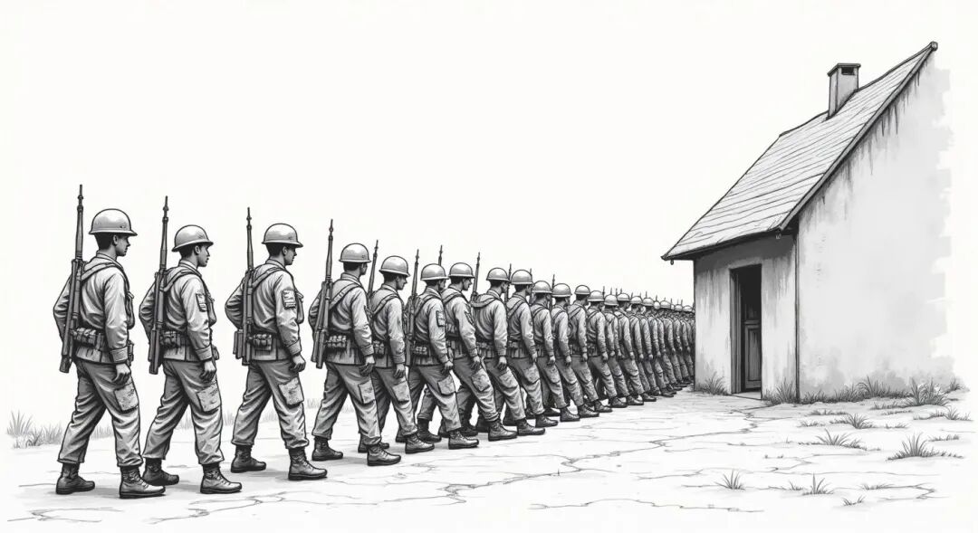 就在这时,他们又被指挥官指令排成横队,朝着一幢房子笔直前进。士兵们突然意识到,指挥官已经没有时间再发出停下的口令,如果不采取行动,他们将会撞到墙上。然而,作为军人,服从命令是他们的职责,于是士兵们勇敢地朝墙壁走去。