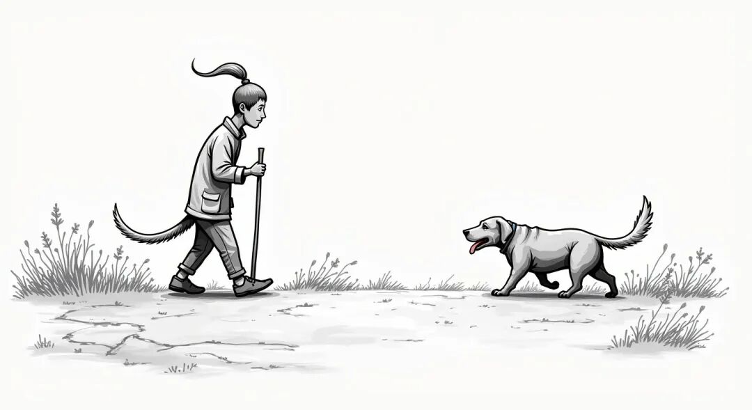 在快进村的时候王瞎子踩到张三家的一条正在打盹的狗,狗“嗷”的一声跑回家了,王瞎子问:“怎么回事?”张三说:“你踩到了我家狗的狗头了。”王瞎子点点头继续走。