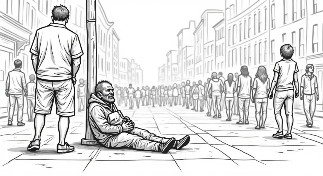 纽约街头。 一个乞丐中暑晕倒,路人围拢过来,议论纷纷。