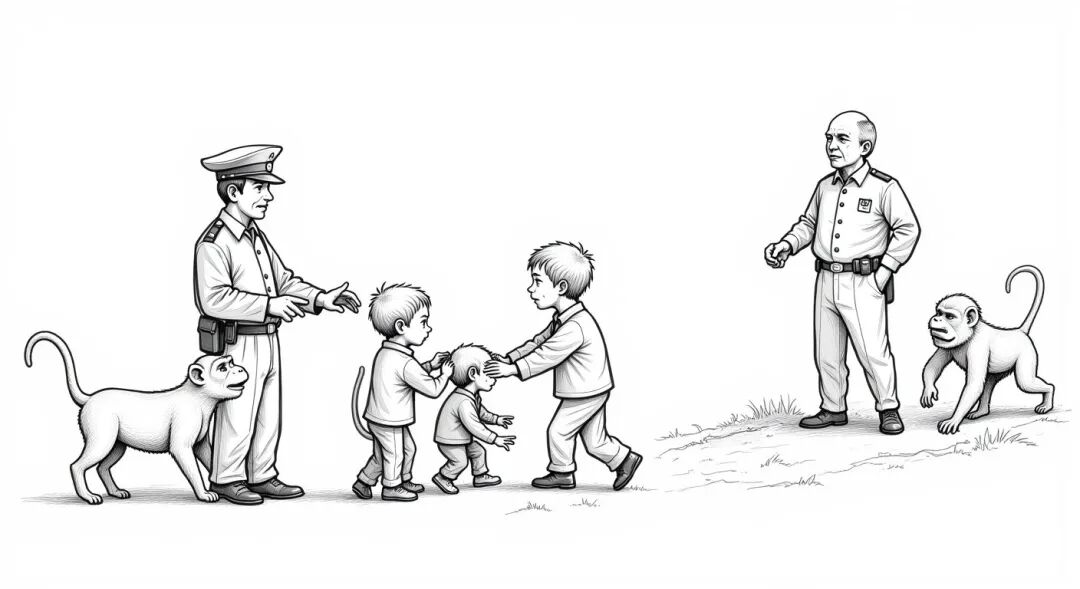 动物园的警卫在猴山附近抓住三个捣乱的顽童,将他们带到园长办公室。