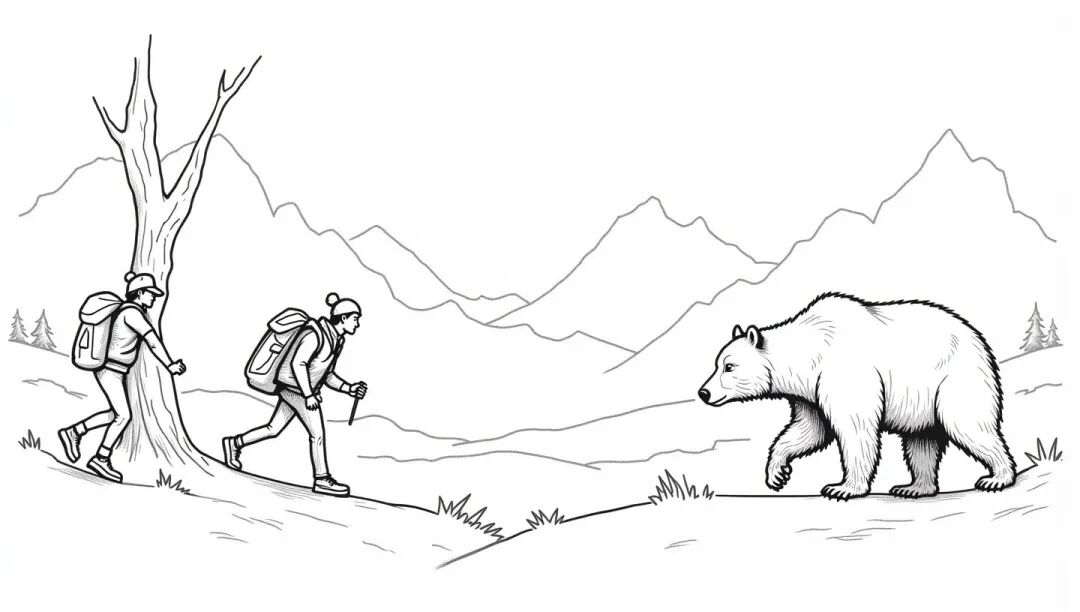 两人在山间徒步旅行。突然,一只熊出现在他们面前,他们物头就跑,熊开始追赶他们。他们爬到了一棵树上,但是,那只熊来到树下,也开始爬树。其中有一个人从他的背包中拿出了运动鞋快速穿上。另一个人嚷道:“你在做什么?”