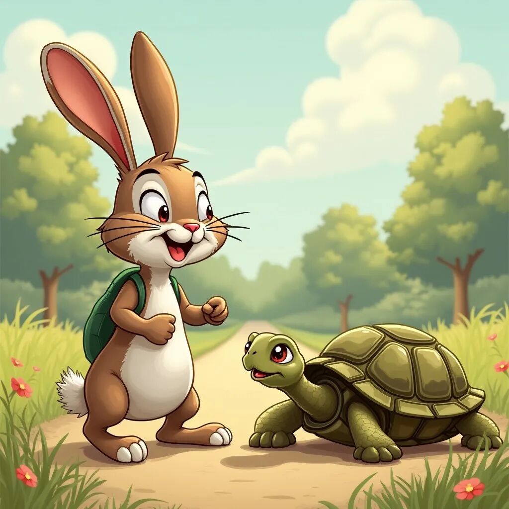 兔子和乌龟不是曾经比赛跑步吗?结果乌龟赢了。这次兔子不服气,要来一场复赛。比赛开始,兔子学聪明了,跑了一半还没敢停下,边跑边喊:“这次我绝不打瞌睡!”谁知一回头,发现乌龟站在终点笑着说:“其实我这次坐公交车来的。”