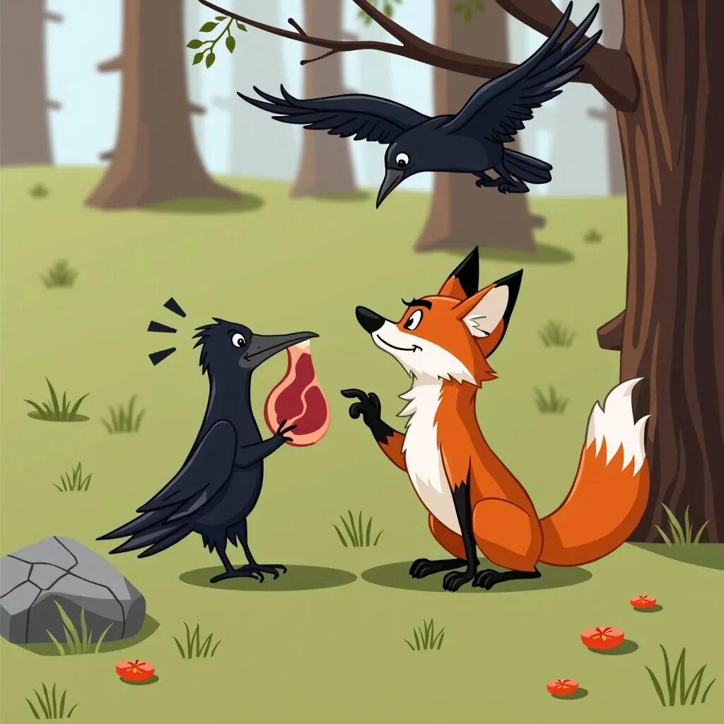 有一天,狐狸见到乌鸦叼着一块肉,心生一计,想骗走这块肉。狐狸假装夸乌鸦的歌声:“乌鸦小姐,你的歌声真是动听极了,能不能再唱一首让我听听?”乌鸦非常警惕,嘴巴紧紧闭着不说话。这时,狐狸心里一想:“既然唱歌没用,那就直接开抢吧!”于是它跳起来,结果乌鸦飞得更高,狐狸落地后尴尬地说:“这肉不新鲜,我不要了!”