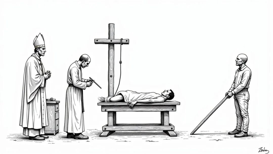 刽子手首先询问牧师,希望他在行刑时脸朝上还是朝下。牧师表示希望脸朝上,以便他能在离世之际望向天堂。于是,刽子手缓缓升起闸刀,并启动了机关。然而,闸刀在离牧师脖子仅有几英寸的地方突然停下了。执行官认为这是神的旨意,于是决定释放牧师。