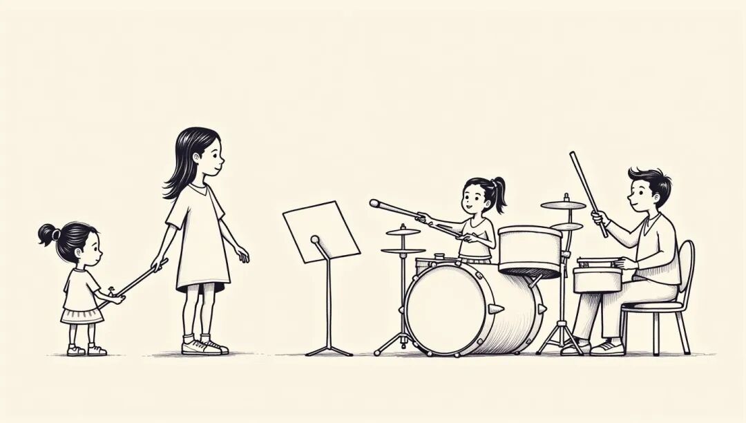 妈妈:“我的乖孩子!你看见那些乐器吗?它们发出了各种不同的声音,那个人就用小棍把它们搅匀了!”