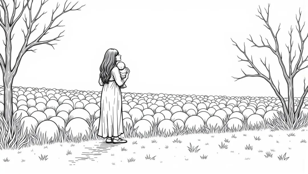 哪知天上没有月亮,误入瓜田,被瓜藤绊了一大跤,孩子也摔在地上。她连忙爬起来,抱起孩子就赶路。