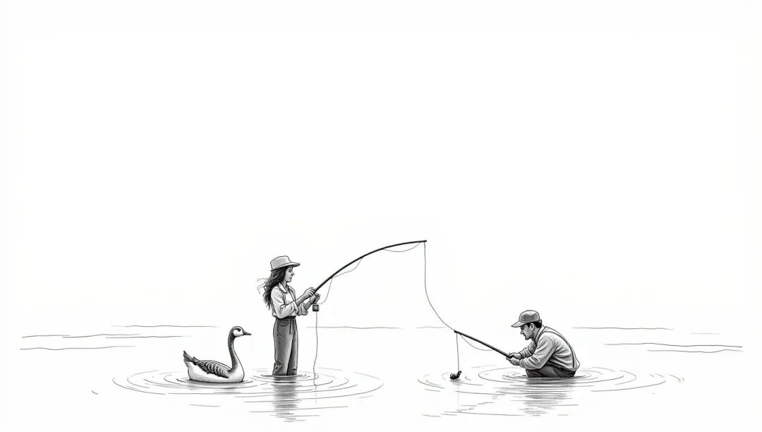 丈夫、妻子一起钓鱼,妻子半天也钓不到。