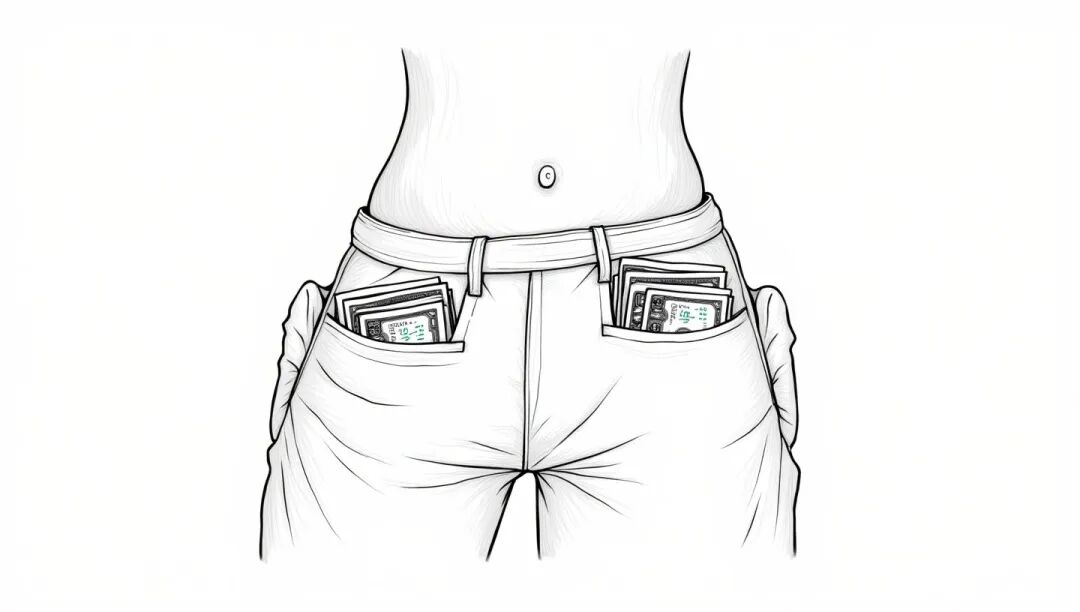 丈夫的一个装着很多现金的钱包找不到了,他正在搜索自己的衣袋。妻子在一旁问: