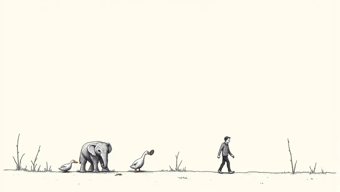 从前,有一个远离家乡的商人,托人给不识字的妻子带回一封信和十两银子。信上没有一个字,只有四幅图画:第一幅画了七只鸭子;第二幅画了一头大象死在地上,一只鹅用嘴在拉象;第三幅画了一把倒放的勺子和十只苍蝇;第四幅画了嫩柳夹道的路上,匆匆走来一个男人。