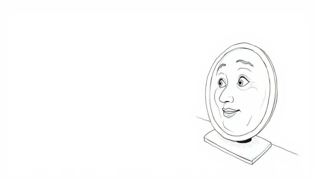 他回到家后,急着上厕所,把镜子往桌子一放就离开了。他妻子从未见过镜子,一看到桌子上有一个闪闪发亮的东西,就好奇地拿起来,往里一看,里边有一个年轻的女人,她一下子就哭起来:“你这个没良心的东西,结婚才两年,就找了小老婆回来。”