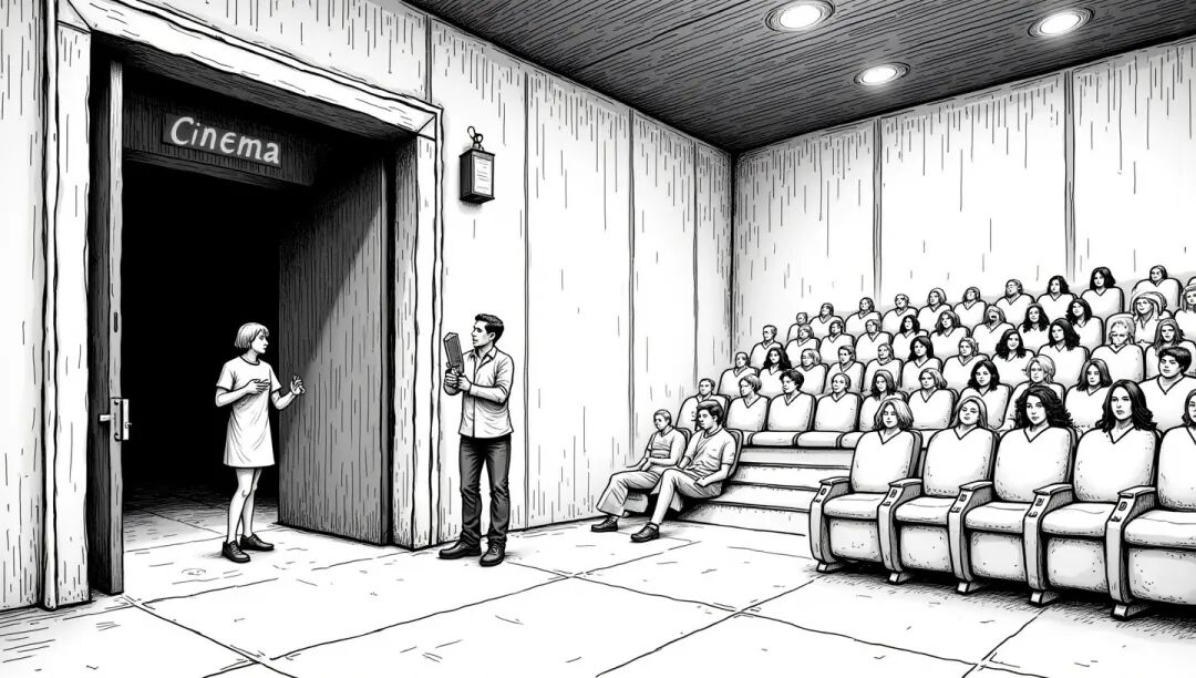 电影院里正在放映一部新片子,突然间有个男人冲到电影院门口,手持一把菜刀,气势汹汹地要杀人。据他说,他妻子跟一个野男人正在这里看电影。