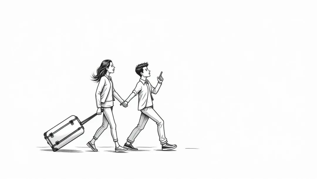 一对恋人准备私弃,当年轻人接住女孩的行李后,大声叫道:“你动作快一些。”