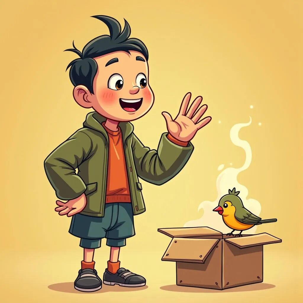 自从李大力上次展示了他的“超能力”之后,他就成了朋友们中的笑料。有一天,他又突发奇想,想要再次展示他的“超能力”。这次,他准备了一个魔术道具——一个空盒子和一只小鸟。