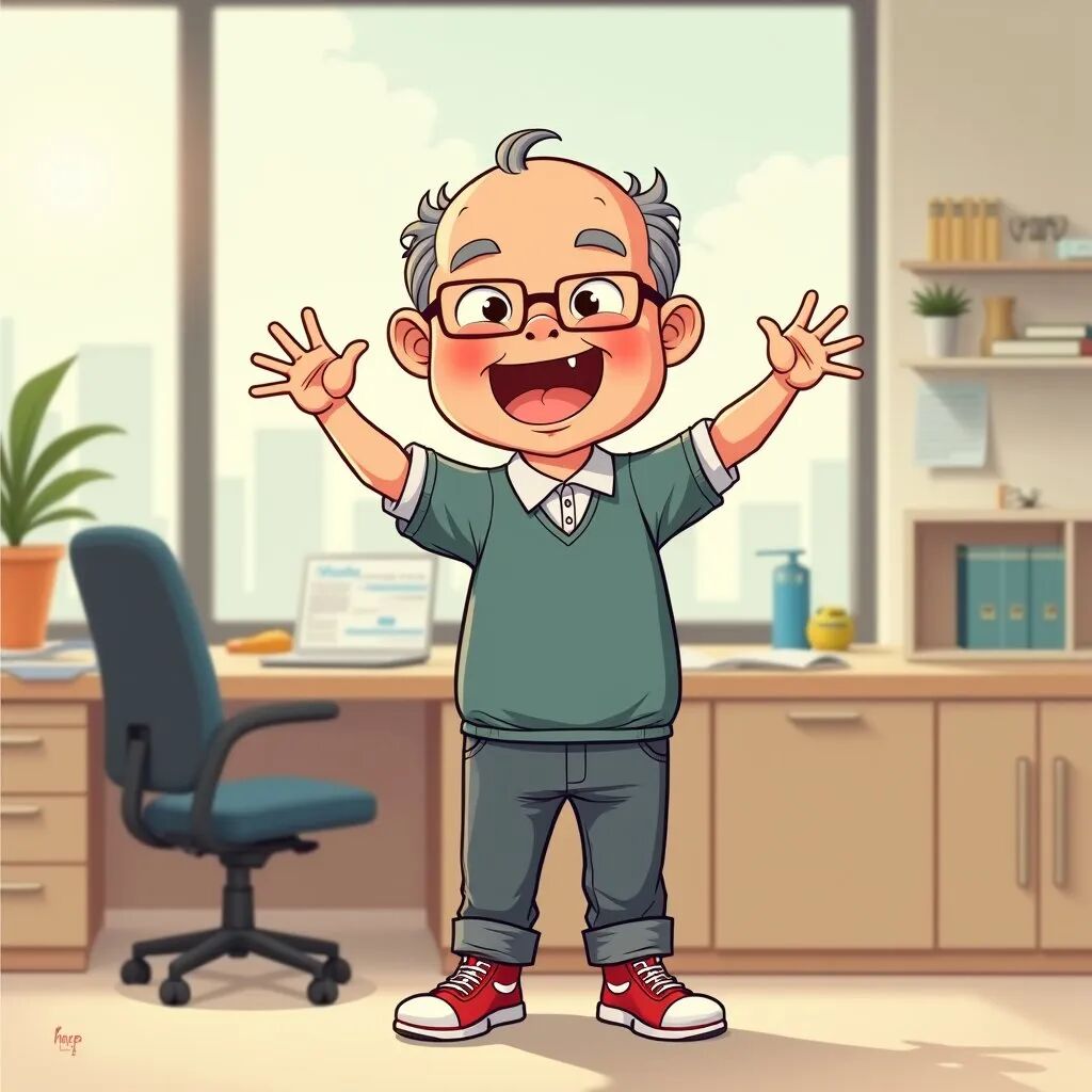 老李,60岁,满心欢喜地以为终于可以退休,回家钓鱼、跳广场舞了。可惜一纸延迟退休的政策下来,他的梦想破灭了。为了保持“工作激情”,老李决定在办公室做健身操。每天中午,他都在工位旁原地打转,边蹦边喊:“我要健健康康上班到80岁!”同事们看得哈哈大笑,还给他起了个新绰号:“退休路上的健美教练”。