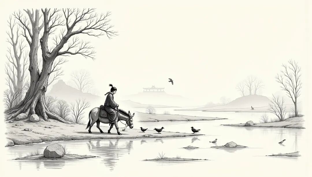 唐代诗人贾岛,有一天到长安城外郊游,看到曲江池边的树旁,有成群的鸟儿在鸣唱,林中隐藏一座古庙景致极佳。他骑在毛驴上,边走边看,触景生情:忽然吟出几句诗来: