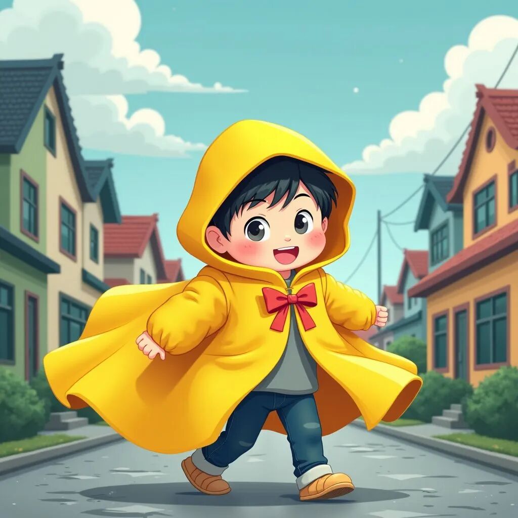 小明台风天在小区里闲逛,穿着一件巨大的黄色雨衣,风吹起来的时候,他的雨衣像披风一样飞舞。小明觉得自己像个英雄,忍不住开始“演戏”:“我是雨衣侠,台风之王,今天我要拯救这个小区!”说完,他潇洒地往前一跳,结果脚下一滑,摔了个屁股蹲。旁边的大妈捂着嘴笑:“小伙子,英雄好身手啊!”