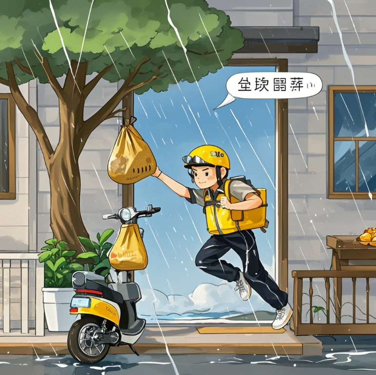 台风天,阿强宅在家里,饿得前胸贴后背,于是他打开外卖APP,选择了一家自己心心念念的炸鸡店。眼看着外卖小哥在风雨中艰难前行,阿强不禁担心:“这风吹得这么猛,小哥不会连人带外卖一块儿给吹跑了吧?”果然,外卖小哥的定位突然一顿,显示他已经到了楼下。阿强赶紧冲下楼,结果一开门,整个人懵住了——外卖袋子挂在树上,而外卖小哥正在树下跟袋子较劲,边跳边喊:“兄弟,别跑啊!”