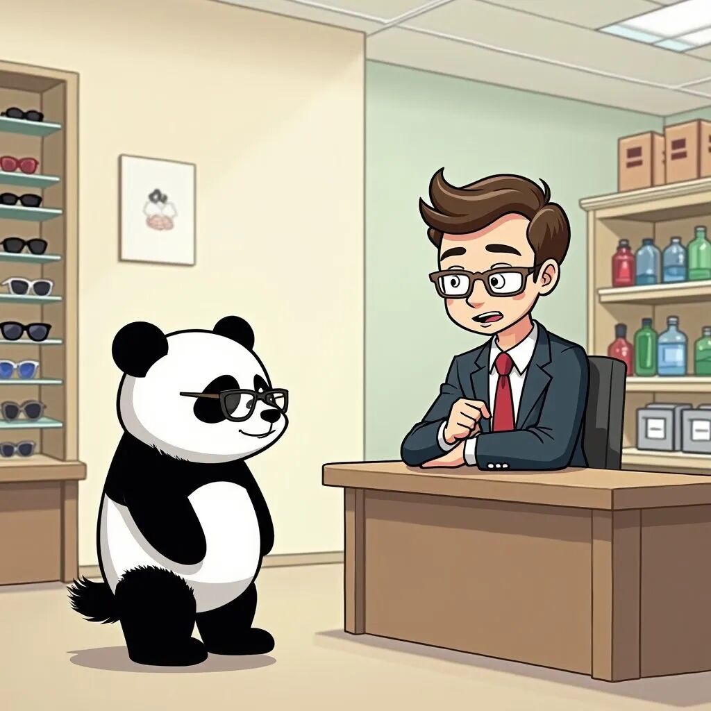 一只熊猫走进了一家眼镜店,它戴着眼镜,对店员说:“我想要一副隐形眼镜。”