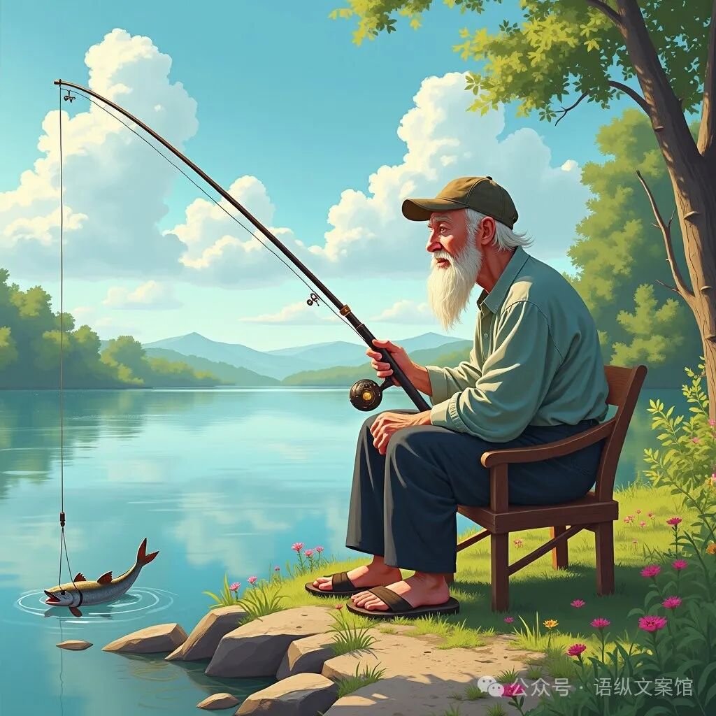 到了湖边,大家纷纷开始下钩,老李不慌不忙,摆出了“高手风范”。他仔细地选了个位置,架好鱼竿,摆好凳子,一脸自信地等着“鱼上钩”。