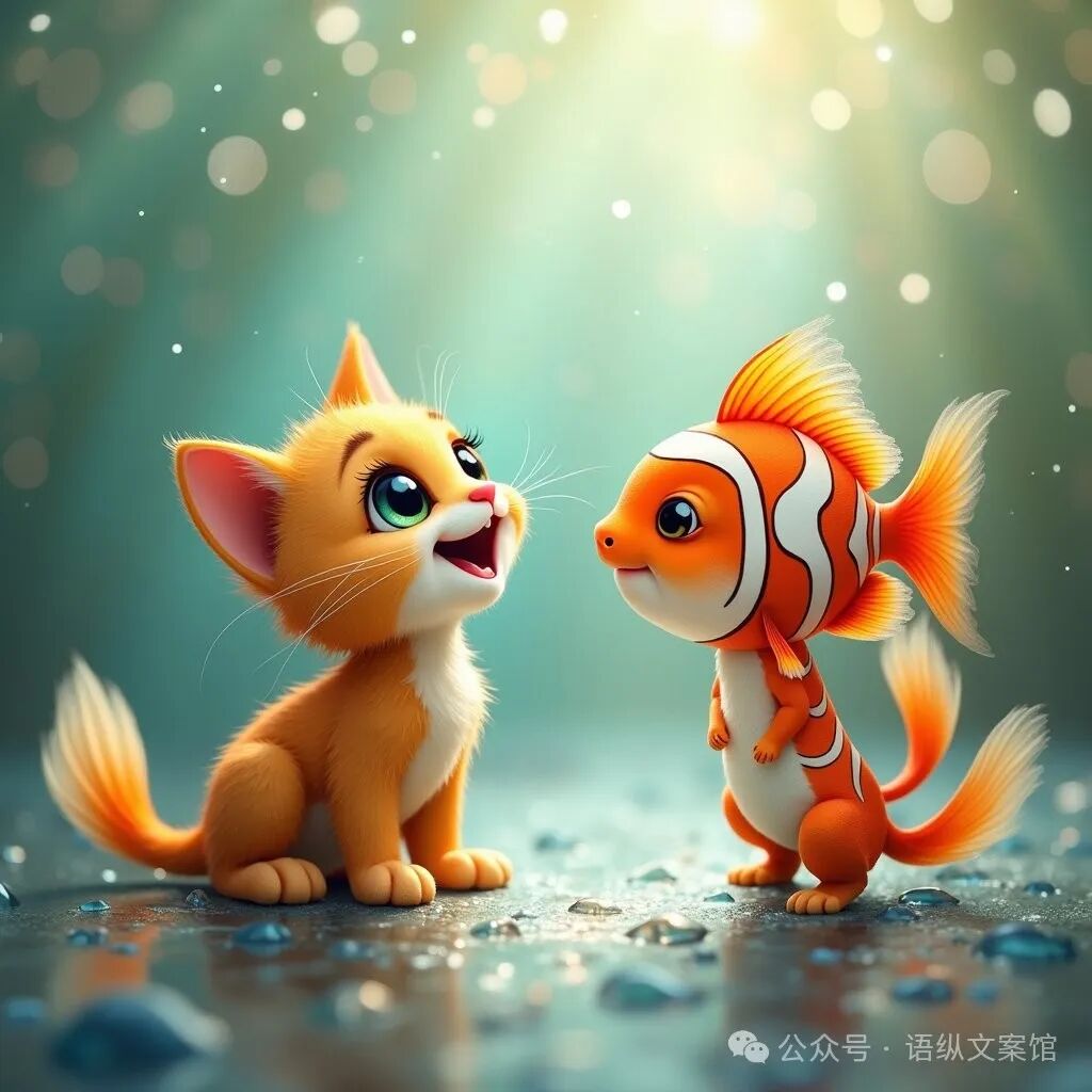 A:鱼儿,你看起来好好吃啊!B:喵喵,不要误会,我只是想看看你的游泳技术而已!