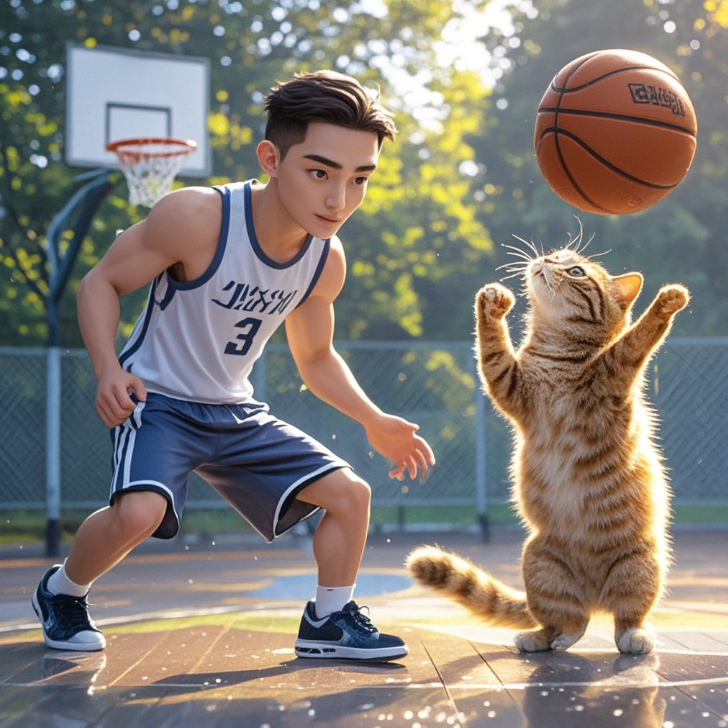 有一位名叫小王的男子,他非常喜欢打篮球。有一天,他看到一只猫正在玩一个篮球。小王觉得这是一个绝佳的机会,他决定和猫一起玩篮球。于是,他拿起篮球,向猫投去。猫敏捷地接住了球,然后迅速扔给了小王。他们一直这样玩着,最后小王累得气喘吁吁,而猫却仍然精力充沛。