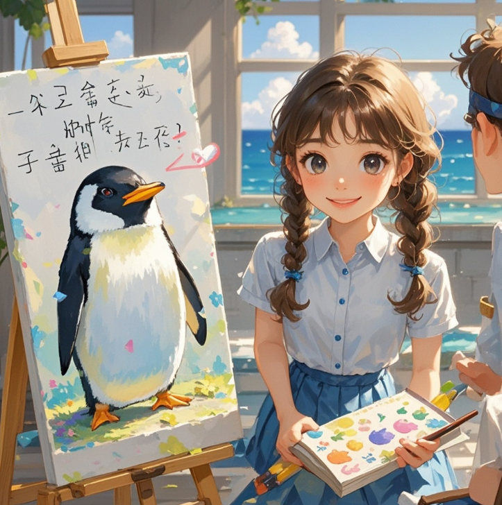 有一位名叫小张的女孩,她非常喜欢画画。有一天,她画了一只企鹅,但是画得不太像。她的朋友看到了这幅画,忍不住笑了起来。小张觉得非常尴尬,于是她决定在画的旁边写上“这是一个有着独特风格的海鸟”。朋友们看到这个备注,笑得更加开心了。