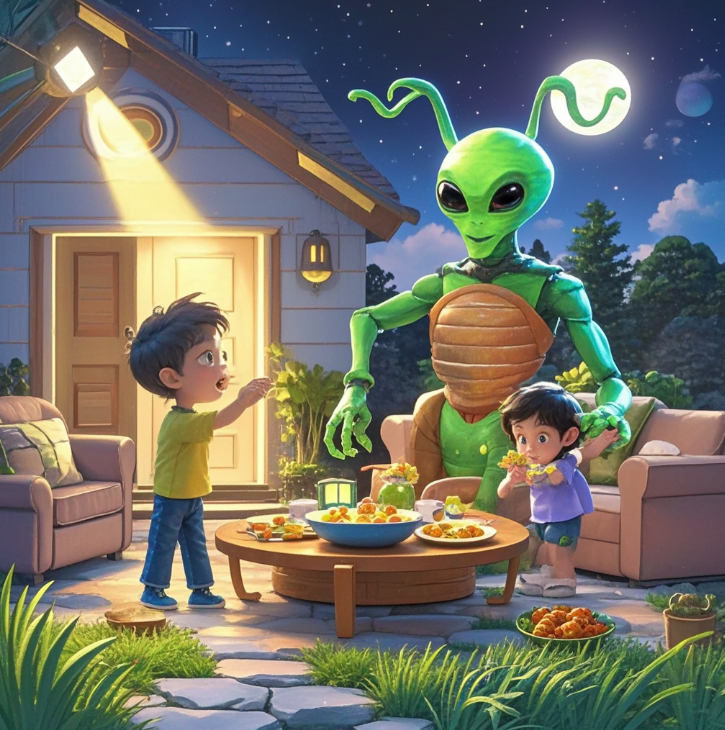 外星人接下来的举动让小明哭笑不得,它开始尝试吃起了门口的草坪!小明忍住笑意,带着外星人来到了家里,给它介绍了各种地球美食。外星人吃得津津有味,还和小明成了好朋友。最后,外星人告别小明,带着满满的美食回到自己的星球。小明感慨万分,这真是一个充满惊喜的夜晚!