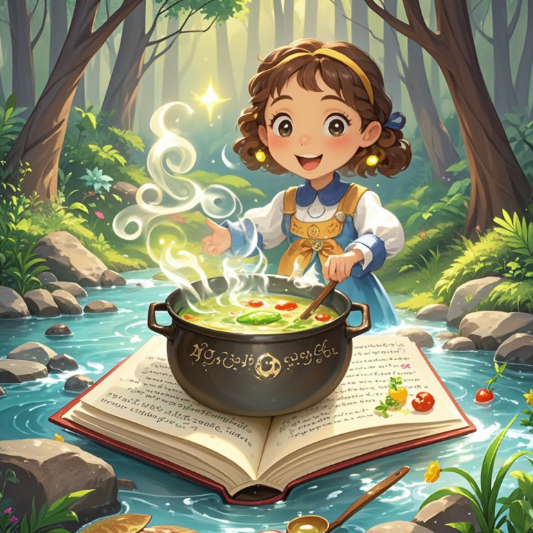 有一天,小丽在森林里捡到了一本神秘的魔法书。书中记载了一个可以实现愿望的魔法汤。小丽兴奋不已,决定亲自尝试一下。